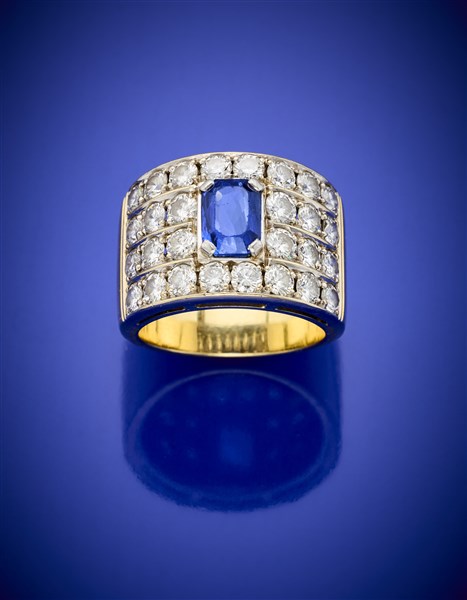 Anello in oro giallo e bianco con diamanti rotondi per complessivi ct. 2,90 circa a segnare la fascia, al centro uno zaffiro ottagonale di ct. 1,90 circa, g 17,99 circa misura 16/56.