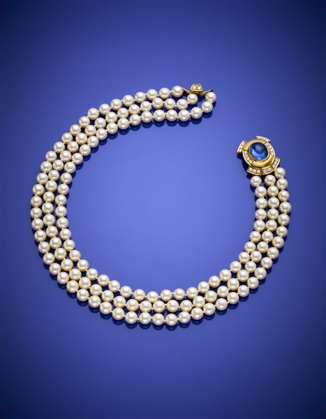 Chiusura in oro giallo diamanti e zaffiro cabochon di ct. 10,00 circa a tenere tre fili di perle coltivate bianche di mm 7/7,50 circa, g 85,40 circa, lungh. cm 38,50 circa. Firmato e marcato Cusi, 1245 MI.