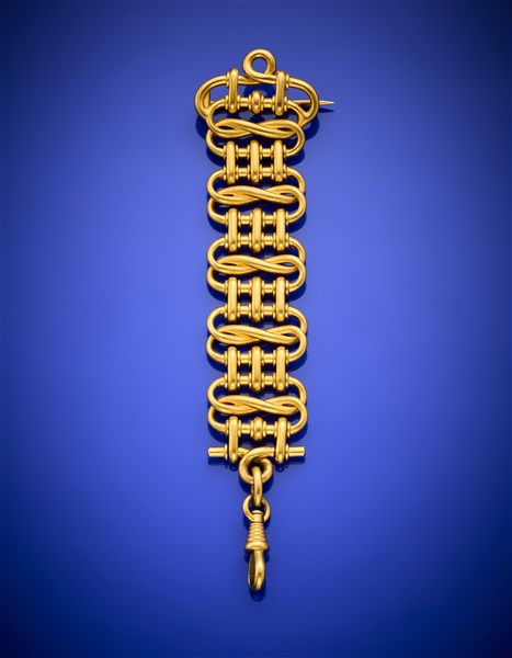 Lot 683 | Spilla in oro giallo con catena inanellata pendente da orologio, g 45,09 circa,