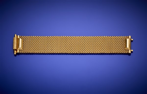 Bracciale a fascia morbida in oro giallo, g 60,81 circa, lungh. cm 20,40 circa. Firmato e marcato Uno.A.R., 1 AR.