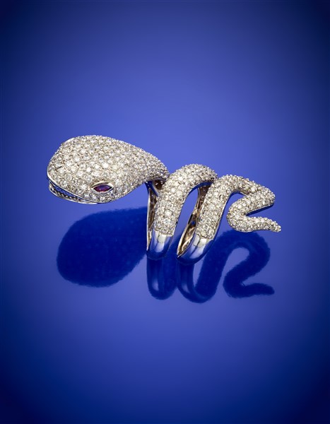 Anello a guisa di serpente in oro bianco e diamanti a pavè per complessivi ct. 7,70 circa, rubini per gli occhi, g 19,64 circa misura 14/54. Con garanzia