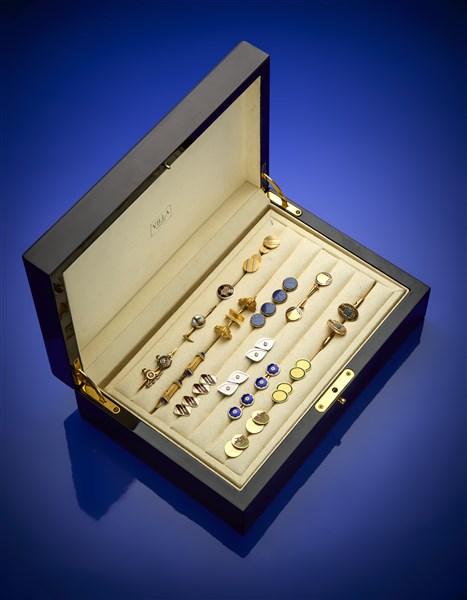 Yellow 18K, 14K and 9K gold lot comprising eleven pairs of cufflinks and three pins accented with enamels, diamonds and semi-precious stones in a "Villa Gioielliere" jewel case, in all g 131.73 circa.