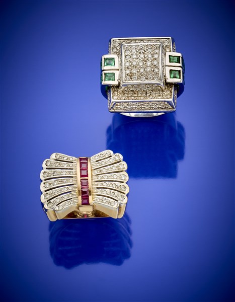 Lotto in oro bianco e giallo composto da due anelli rifiniti in diamanti con rubini e smeraldi calibré, complessivi g 35,51 circa misura 18/58, 19/59. (difetti e mancanze)