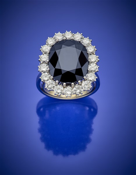 Lot 710 | Anello in oro bianco con zaffiro ovale di ct. 11,00 circa e diamanti rotondi pe