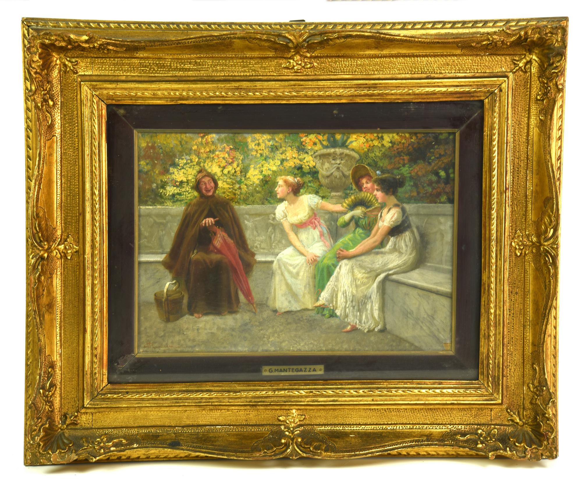 Giacomo Mantegazza CONVERSAZIONE IN GIARDINO olio su tela, cm 25x35 firma