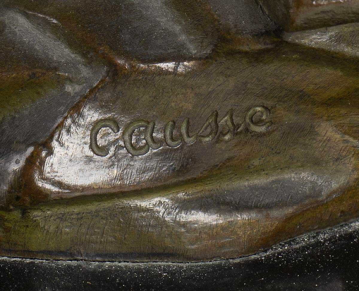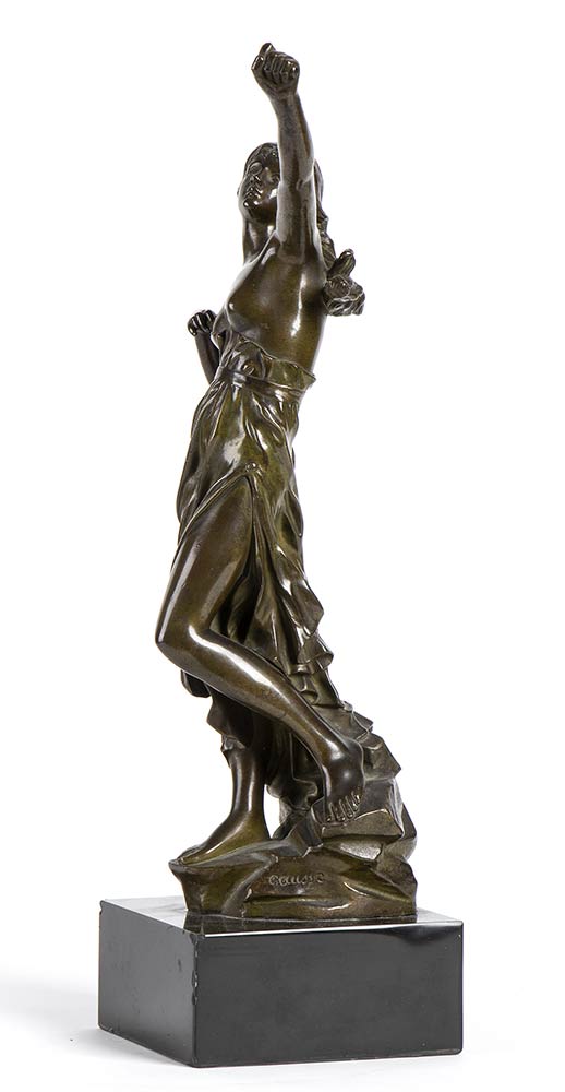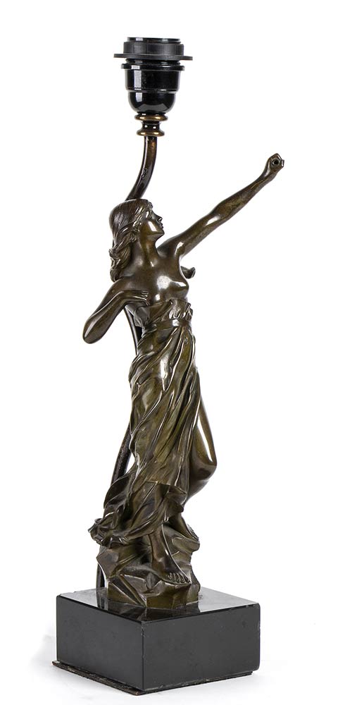 figura di fanciulla in metallo fuso rifinita in bronzo, stante su una base di marmo nero. Firmata "Caussé". Altezza 33 cm, base 5 x 11 x 11 cm. Altezza con porta lampada 46 cm. Stato di conservazione: **** buono, piccoli difetti alla base.