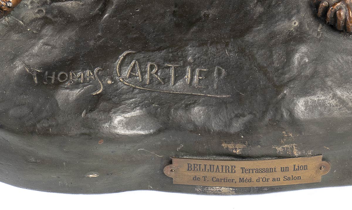 in terracotta, intitolata "Belluaire terrassant un lion". Firmata Thomas Cartier. Dimensioni 63 x 50 x 27 cm. Stato di conservazione: ***** eccellente.
