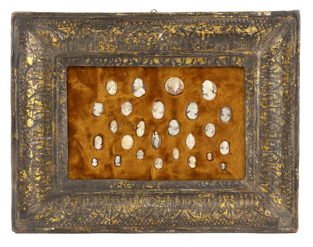 26 cammei su conchiglia entro cornice lignea dorata 22,8 x 29,8 cm. Stato di conservazione: **** buono.