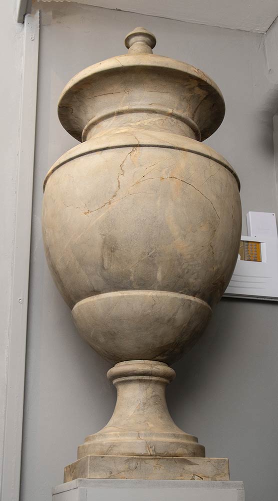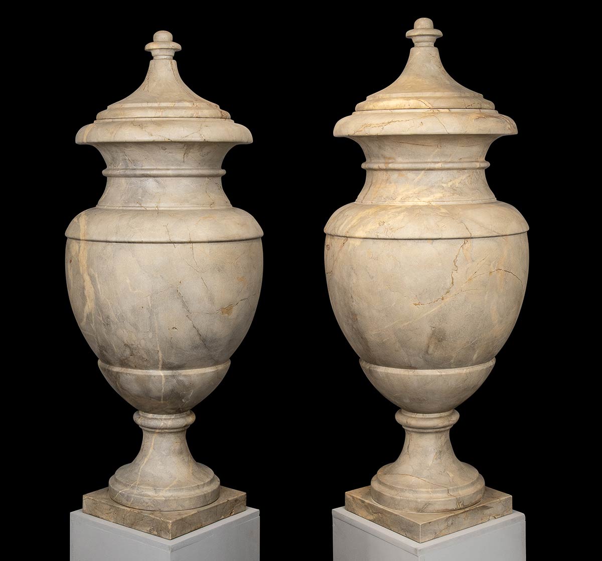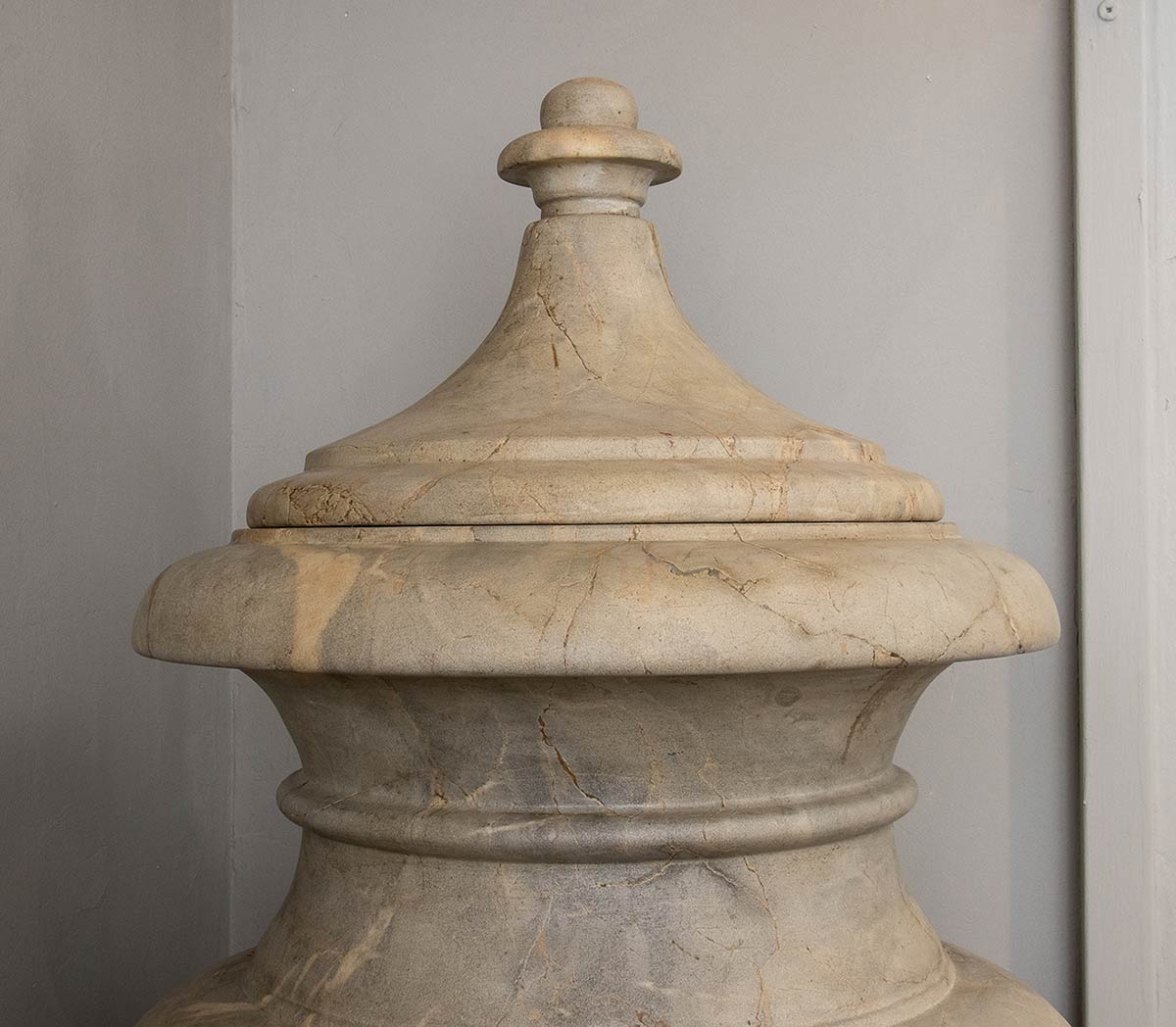 in marmo Sarrancolin Versailles, con coperchio. Altezza vasi 140 cm, diametro massimo 60. Stato di conservazione: **** buono.