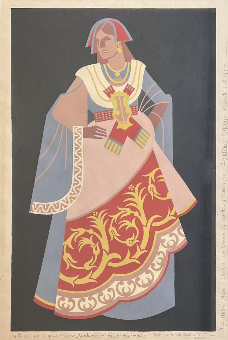 Fortunato Depero (Fondo 1892 - Rovereto 1960) Architetture, costumi e prodotti italici, 1943;Tempera su cartoncino, 64 x 40 cm, in cornice