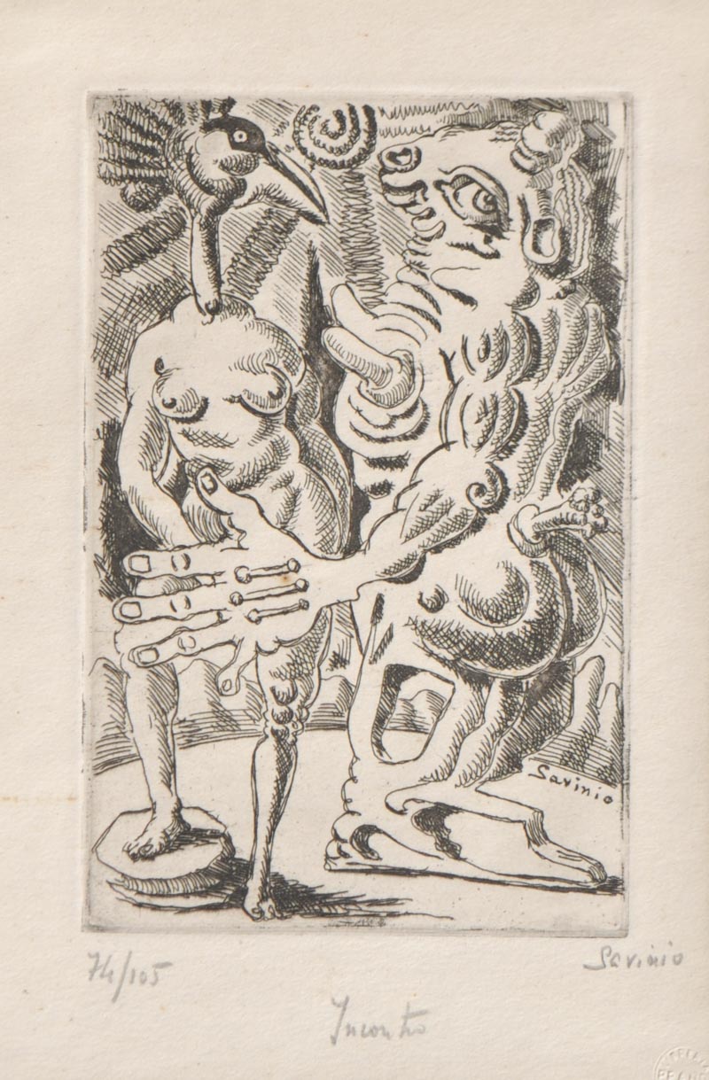 Alberto Savinio (Athen/Atene 1891 - Rom/Roma 1952) Incontro, 1944;Acquaforte su carta, 17 x 10,6 cm, foglio 22,5 x 15,5 cm, timbro a secco "Libreria Prandi Reggio Emilia", tavola tratta dall'edizione "Stratagemmi d'amore di Gentile Sermini".
