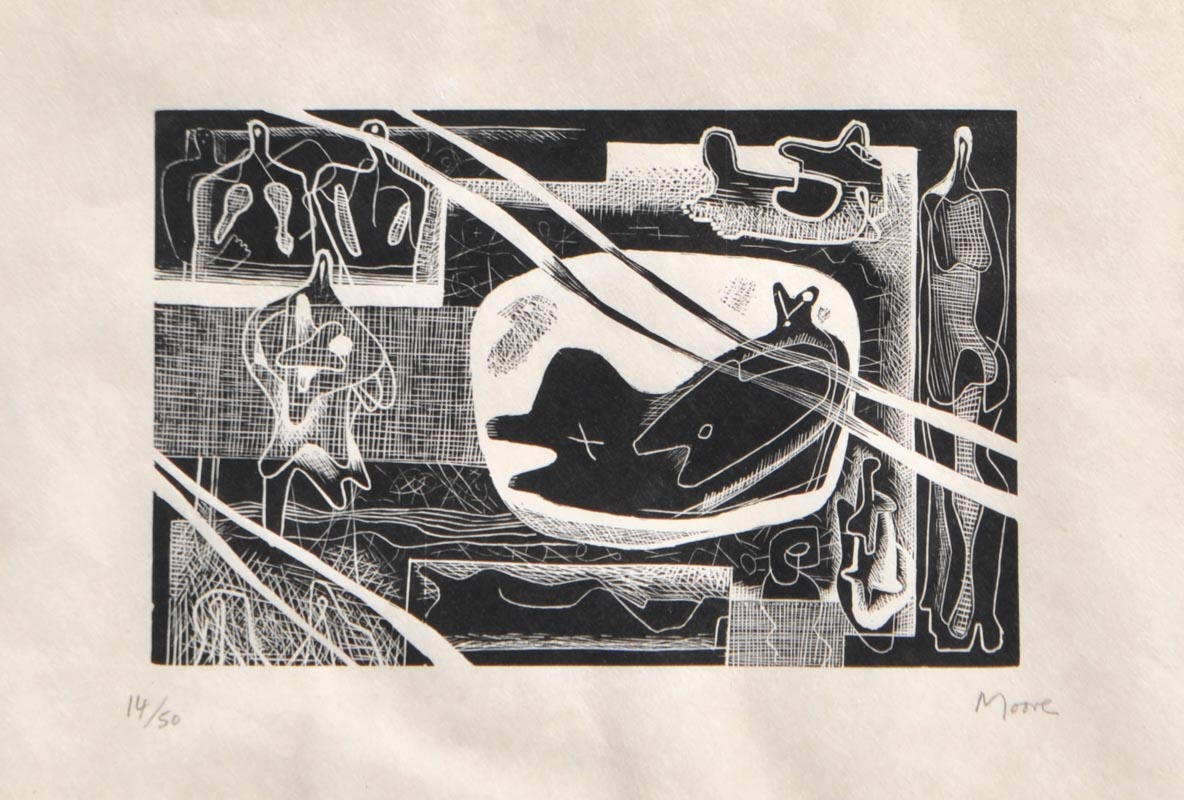 Henry Moore (Castleford 1898 - Perry Green 1986) Figures/scultures, 1931/1966;Xilografia su carta giapponese, 12,9 x 19,6 cm, foglio 23,5 x 33,5 cm, edizione del 1966 di Gérald Cramer Ginevra