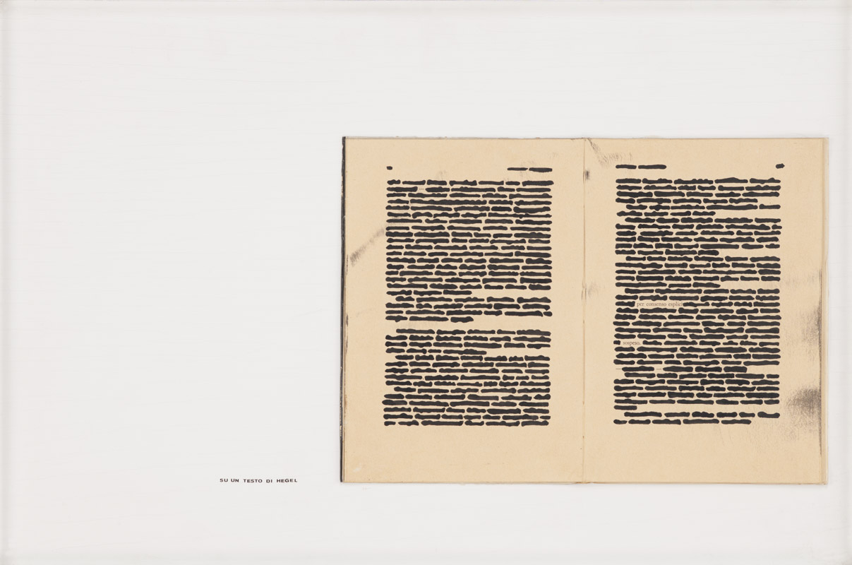 Emilio Isgrò (Barcellona di Sicilia, 1938) Su un testo di Hegel, 1971;China su Libro tipografico in box di legno e plexiglass, 41 x 61 cm, al retro etichetta e timbro Studio Guastalla Milano.
