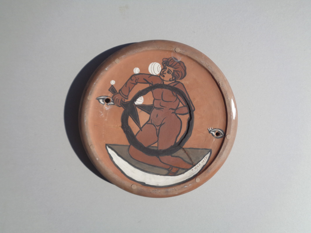 Tono Zancanaro (1906 - 1985) Figure, 1953;Piatto in terracotta dipinta al fronte e al retro, lievi crepe ai bordi