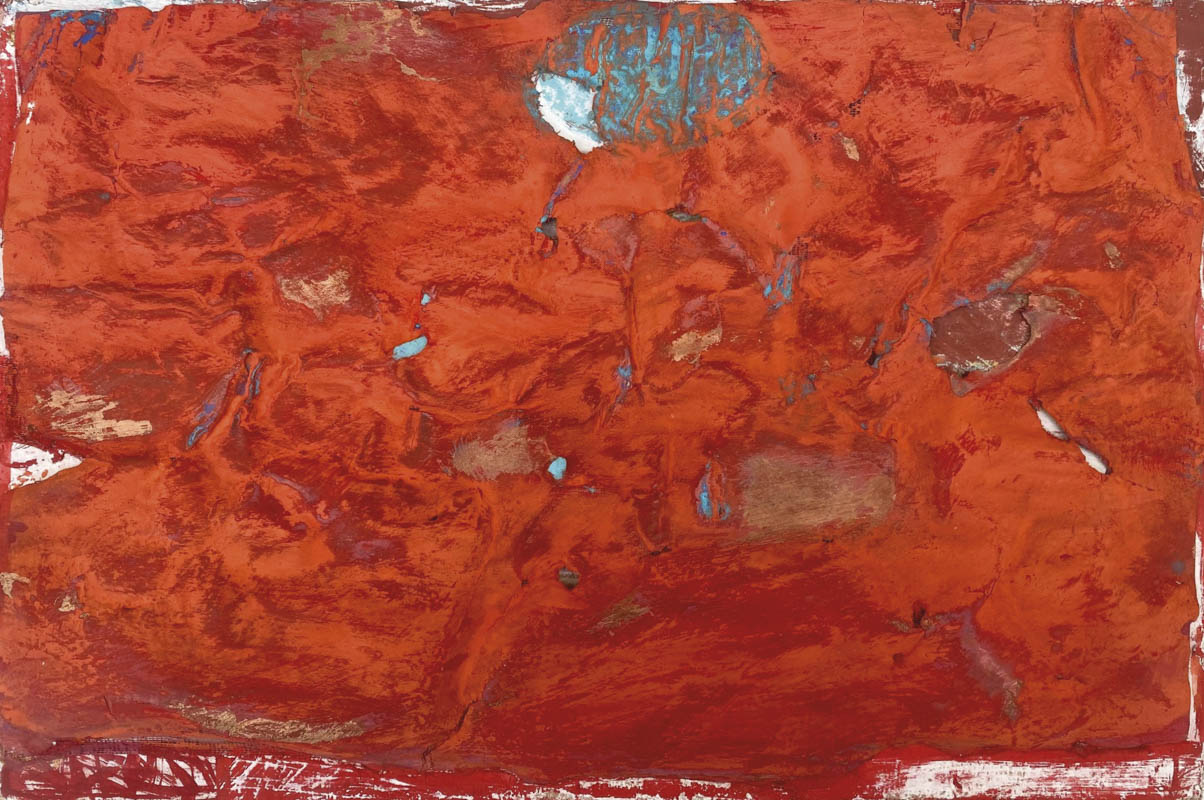 Franco Guerzoni (Modena 1948) Scavi superficiali, 1987;Tecnica mista su carta, su garza, su tela. 40 x 60 cm, al retro etichetta e timbro della galleria Meta, Bolzano