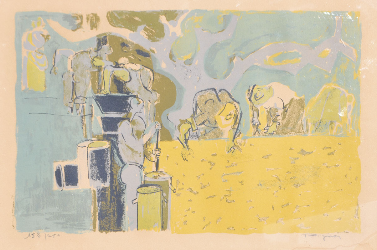 Edouard Pignon (Bully-les-Mines 1905 - La Couture-Boussey 1993) Vendemmia, 1952;Litografia a col. su carta, 38 x 55 cm, al retro etichetta "Mostra selezione d'arte europea, Municipio di Livorno 1958 Bibl.: Catalogo "Mostra Selezione d'arte europea, Casa comunale della cultura, Livorno 15 - 29 maggio 1958 (nr. 91 elenco delle opere)