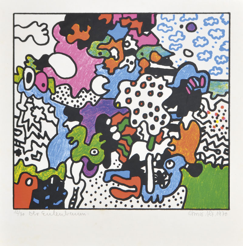 Otmar Alt L’albero dei gufi, 1970;Litografia a col. su carta, 50,5 x 48,5 cm