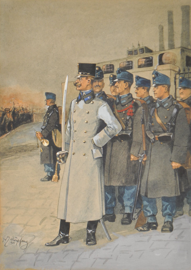 Fritz Schönpflug (Wien/Vienna 1873 - 1951) Forze armate k.k. in difesa di una fabbrica, Prima Guerra Mondiale, 1915;Acquerello, 31 x 22 cm, cornice d'oro originale Firma e data