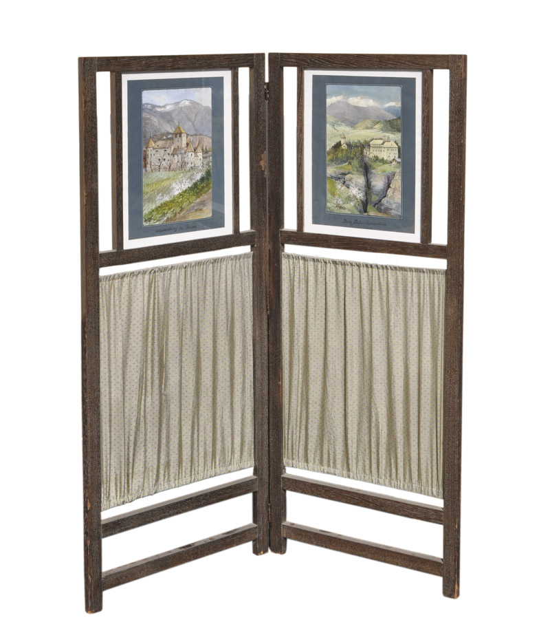 Anonym Paravento cojn acquerelli Wasserburg bei Bozen und Burg Thun, 1918;Paravento: legno, stoffa, 140 x 109 cm; acquerelli: 34,2 x 20,8 cm ciascuno,