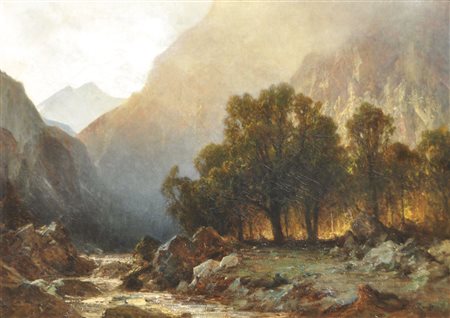 Julius Lange (Darmstadt 1817 - München/Monaco di Baviera 1878) Paesaggio alpestre;Olio su tela, 82 x 114 cm, restaurato, imponente cornice d'epoca Firma