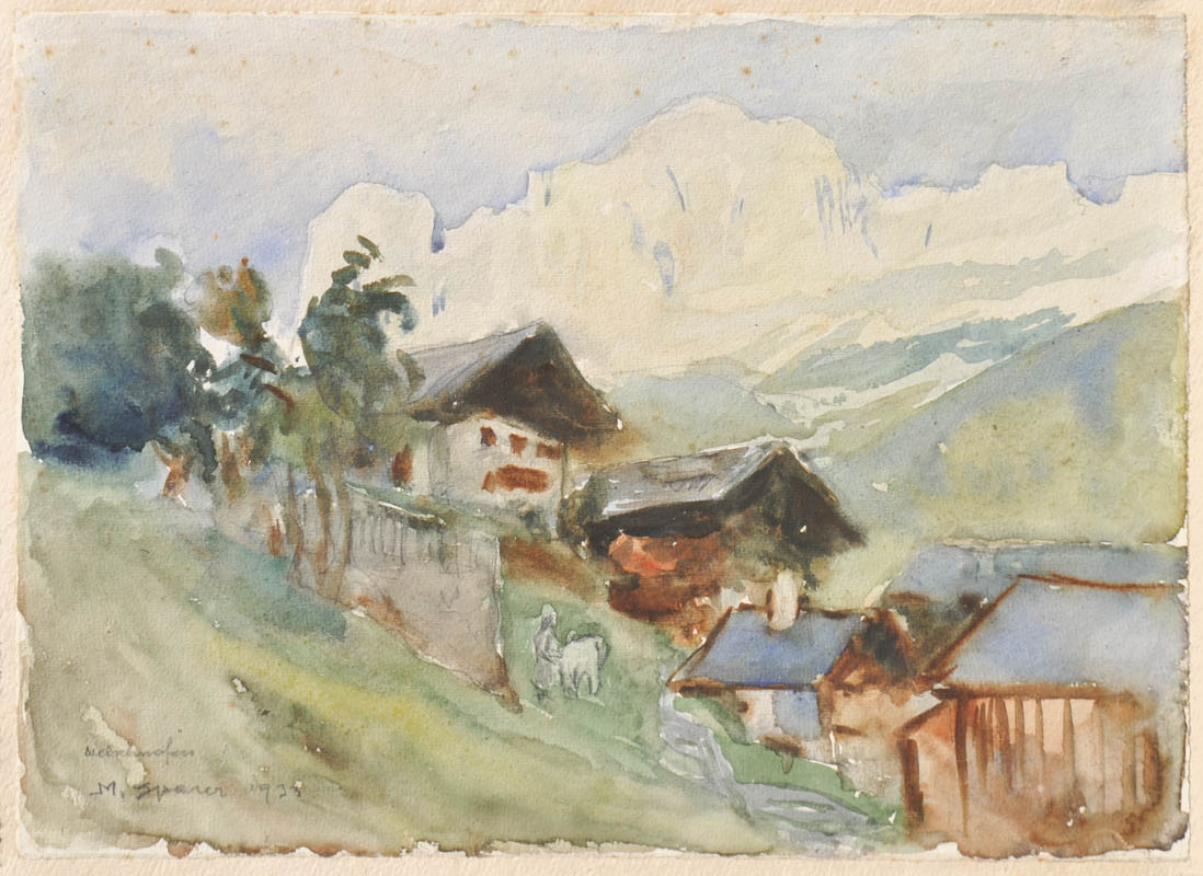 Max Sparer (Söll, Tramin/Termeno 1886 – Bozen/Bolzano 1968) Nova Levante, 1933;Acquerello e matita su carta su cartone, 24 x 33,2 cm, leggere macchie
