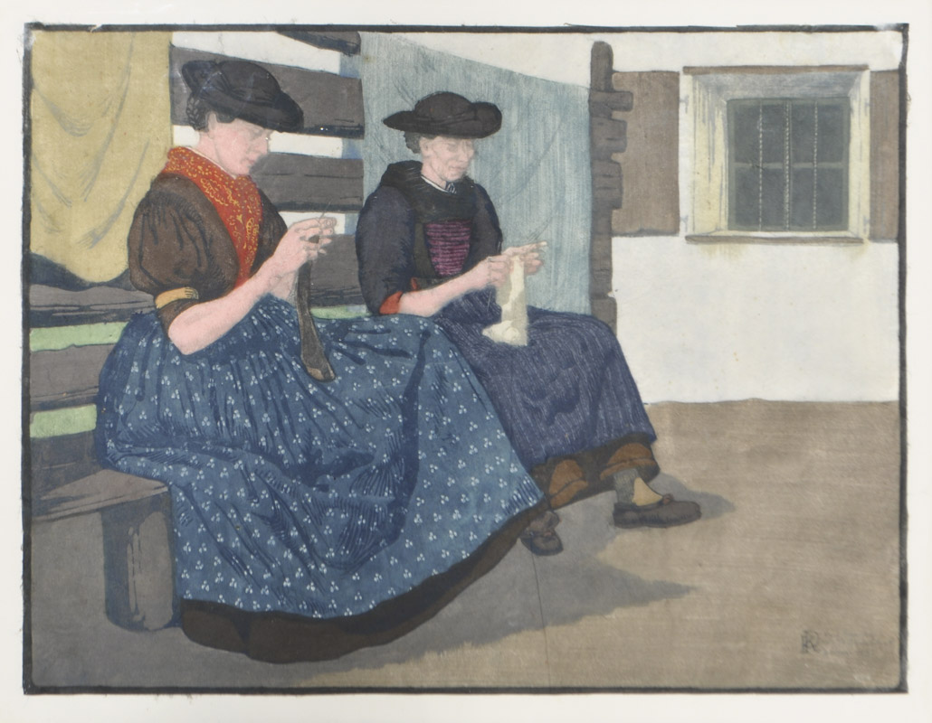 Karl Pferschy (Deutschlandsberg 1888 – Bozen/Bolzano 1930) Donne della Val Sarentino che lavorano a maglia, 1913;Xilografia a colori, 42 x 55,5 cm, mancanze agli angoli superiori, in cornice
