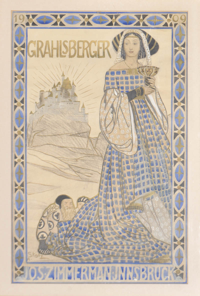 Albert Stolz (Bozen/Bolzano 1875 / 1947) Bozzetto per manifesto Grahlsberger Jos. Zimmerman Innsbruck, 1909;Acquerello, carboncino, colore oro, 70 x 45,5 cm, in cornice