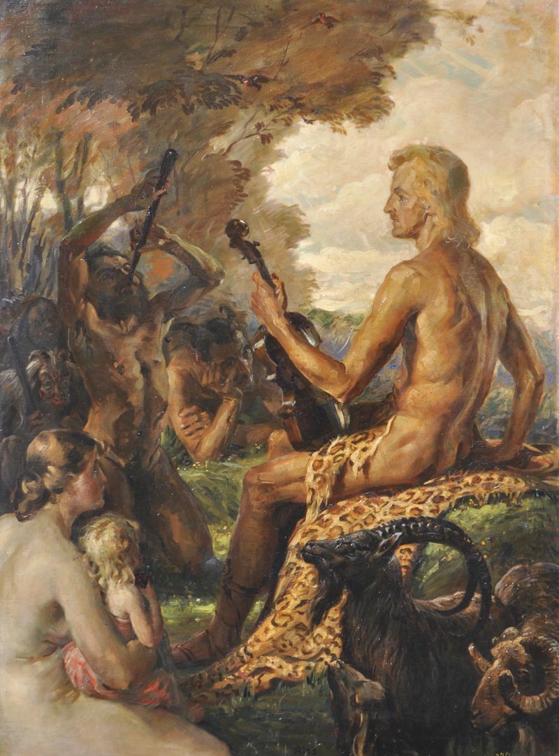 Thomas Riss (Haslach, Stams 1871 – Innsbruck 1959) Apollo e Marsia, 1910 ca;Olio su tela, 104 x 76 cm, in cornice