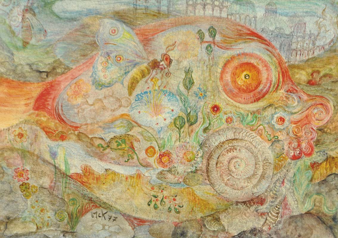 Michael Coudenhove-Kallergi (Prag/Praga 1937 – Wien/Vienna 2018) Paesaggio fantastico con pesce, 1977;Tempera su tavola, 24 x 34 cm, in cornice