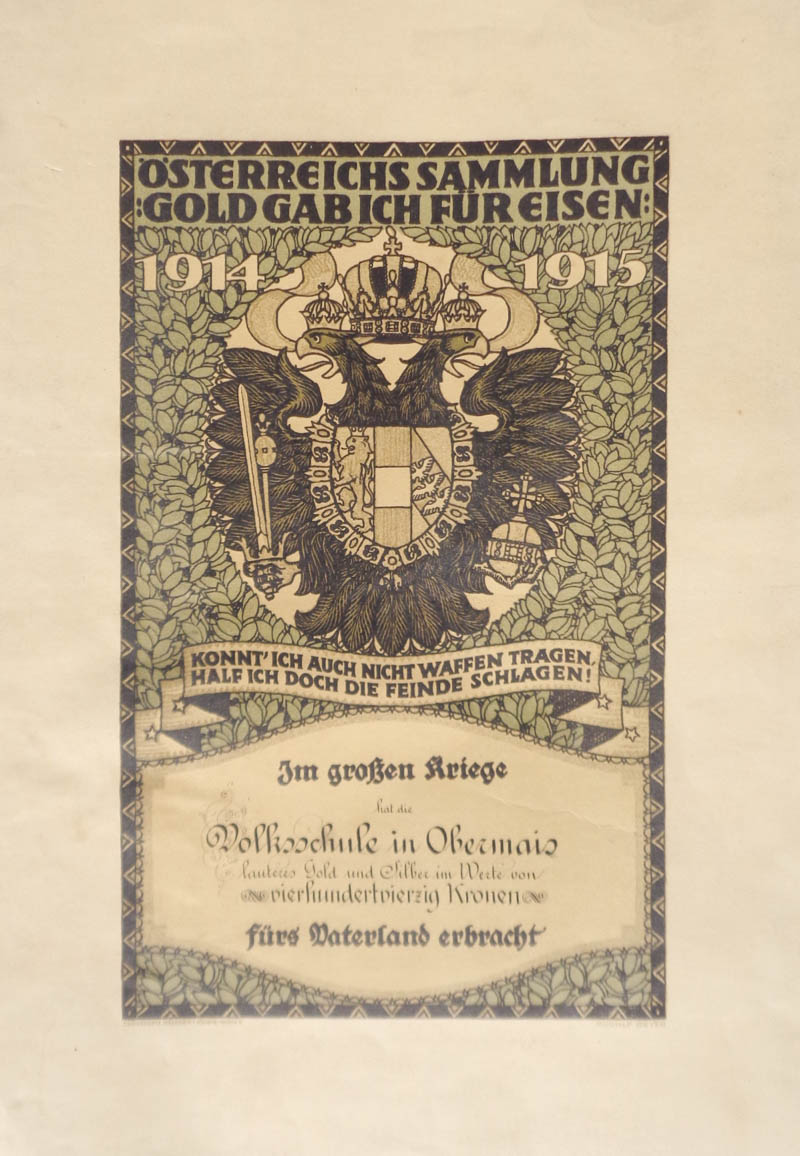 Anonym/anonimo Volkschule Obermais, 1914/1915;Stampa, 65 x 47 cm, testo „Im großen Kriege hat die Volksschule in Obermais lauteres Gold und Silber im Werte von vierhundertvierzig Kronen für Vaterland