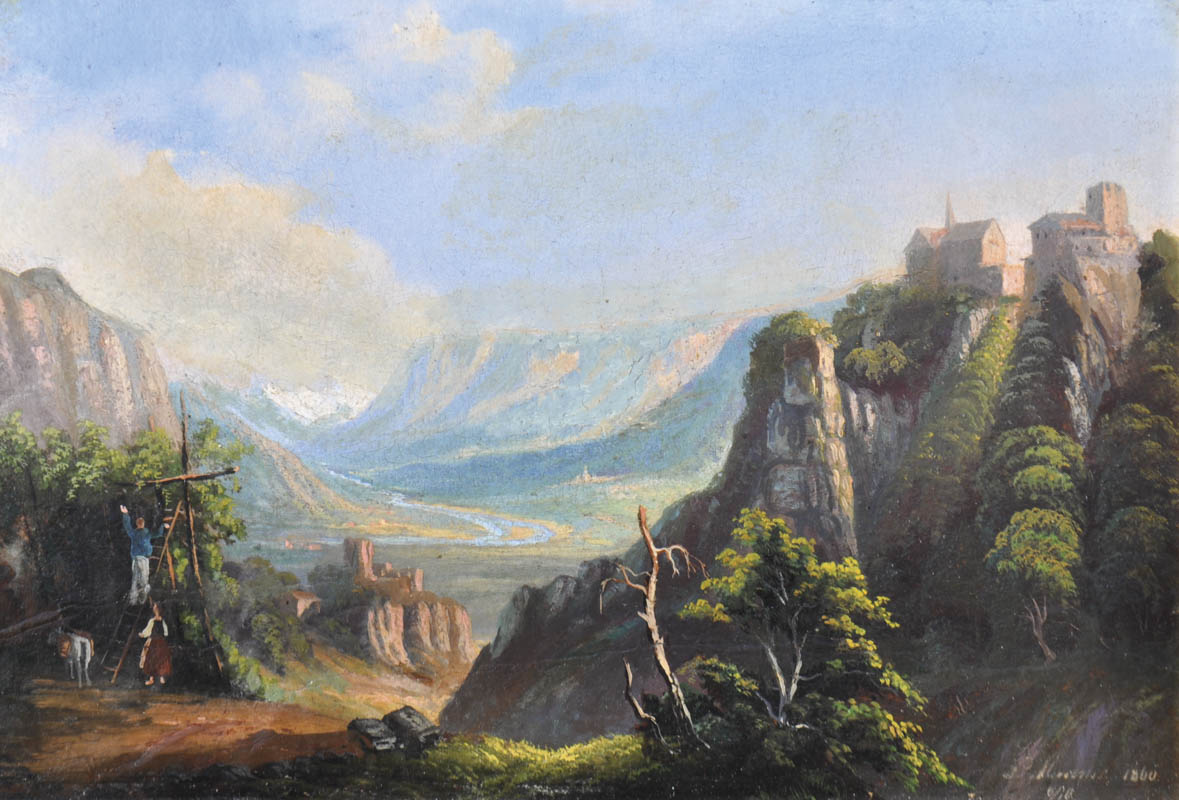 Maler um 1860/Pittore del 1860 ca. Castel Tirolo con Castel Fontana;Olio su cartone, 21 x 31 cm, scheggiature di