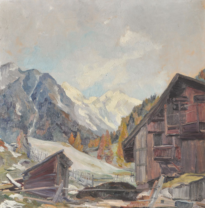 Karoline Hafner-Scholz (Wien/Vienna 1898 – 1984) Maso a Trins nella valle Gschnitztal;Olio su tavola, 46,5 x 46 cm, in cornice