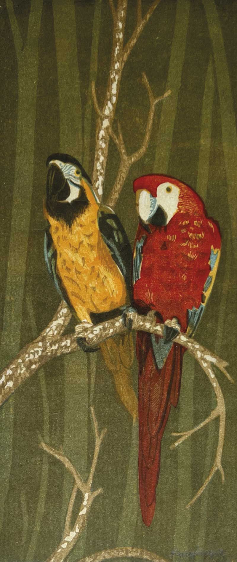 Rudolf Lanzinger (Brixen/Bressanone 1913 – Bruneck/Brunico 1989) Coppia di papagalli;Xilografia a colori, 30 x 13 cm