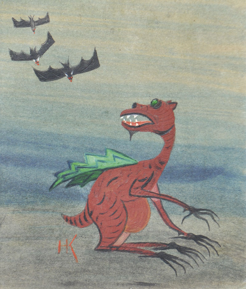 Hans Kompatscher (Völs am Schlern/Fiè sullo Sciliar 1906 – Bozen/Bolzano 1988) Drago, 1988;Tecnica mista su cartone, 19 x 16 cm, in