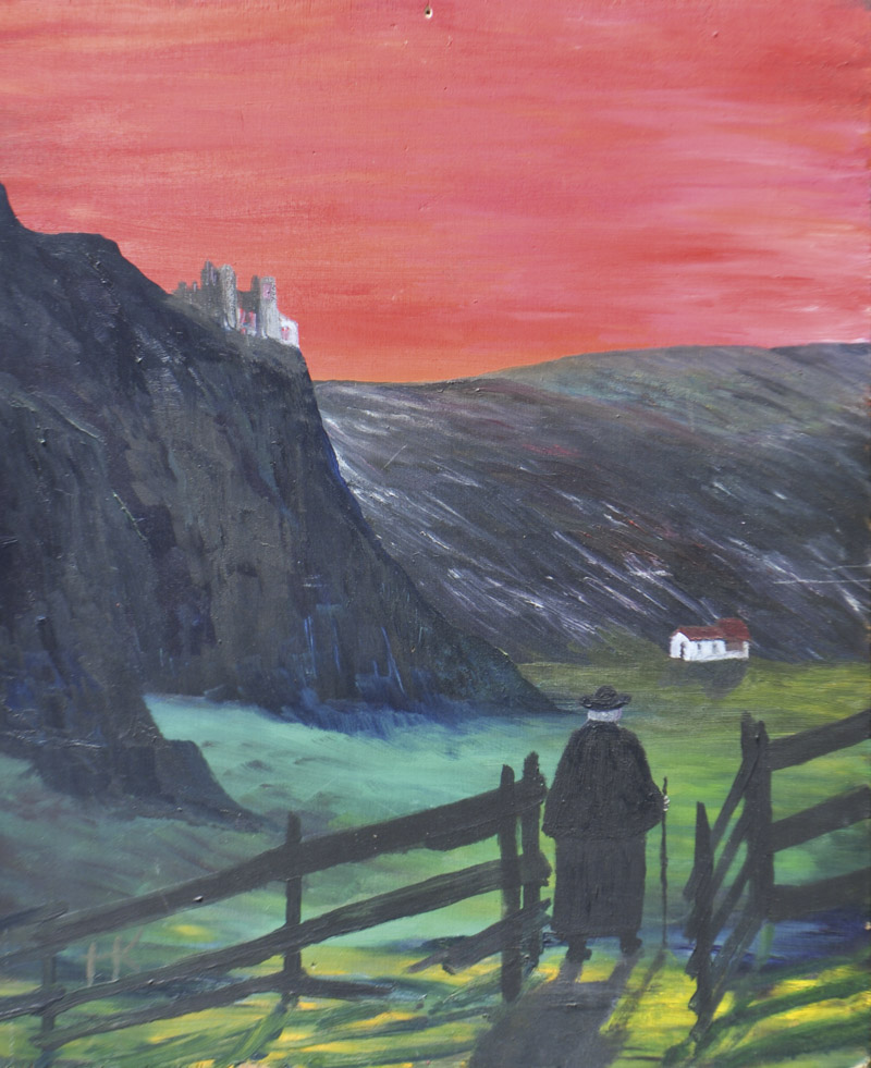 Hans Kompatscher (Völs am Schlern/Fiè sullo Sciliar 1906 – Bozen/Bolzano 1988) Escursionista notturno sotto la rovina di Castelvecchio;Olio su compensato, 50,8 x 42 cm Monogramma