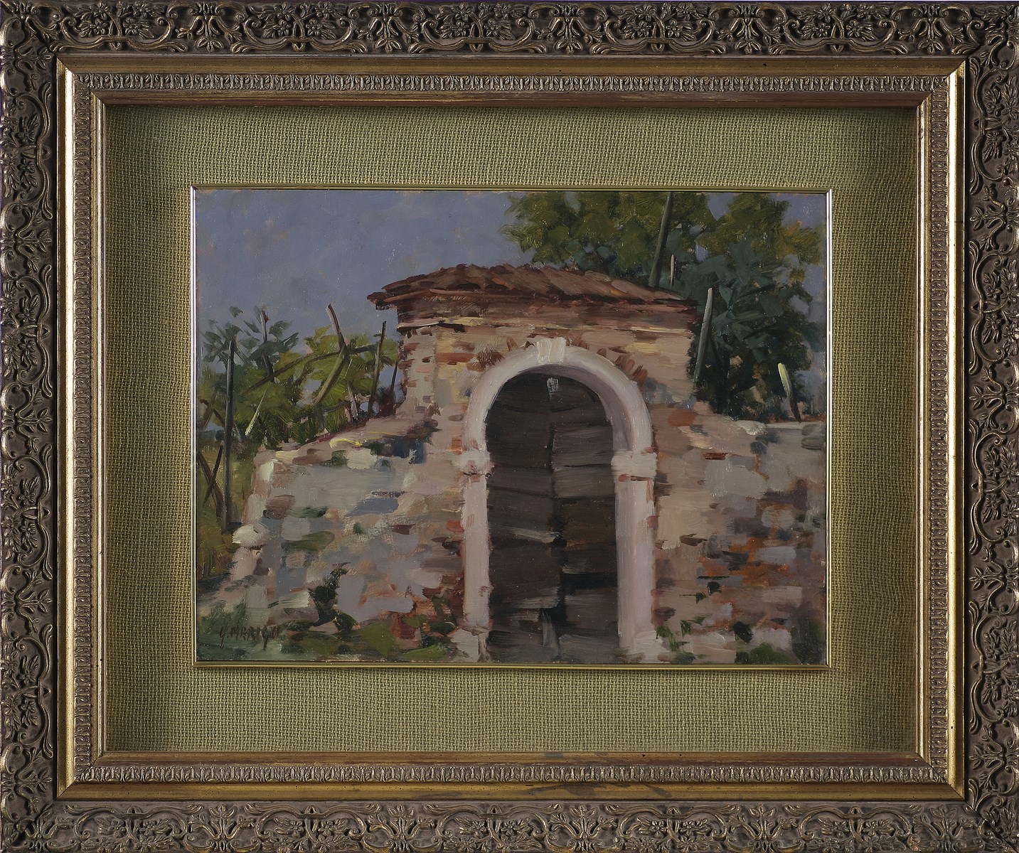 MERIGO GIUSEPPE (n. 1930) Portone. Olio su tavola. Cm 40,00 x 30,00. Firma in basso a sinistra. Cornice presente