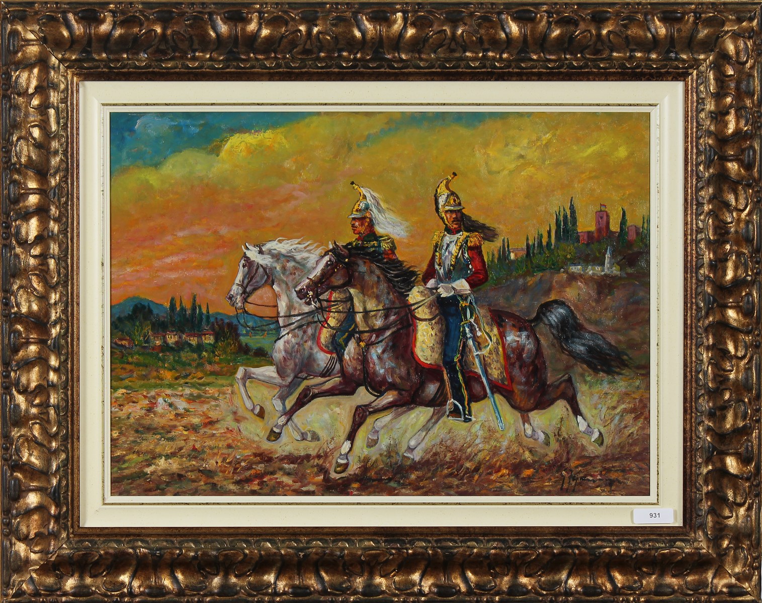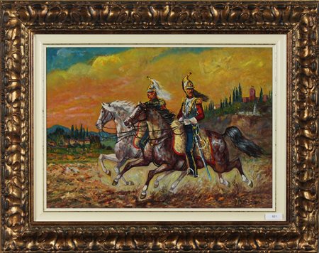 GONZAGA GIOVAN FRANCESCO (1921 - 2007) Cavalli al galoppo. Olio su tela . Cm 70,00 x 50,00. Firma in basso a destra. Al retro titolo e firma. Autentica dell'artista su fotografia. Cornice presente