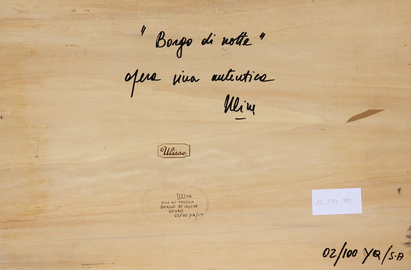 ULISSE (n. 1957) Bagno di notte. 2002. Olio su tavola. Cm 60,00 x 40,00 x 1,50. Firma in basso a destra. Al retro descrizione dell'opera a cura dell'artista con relativo numero d'archivio e firma per autentica. Certificato di garanzia a cura dell'Istituto Diffusione Arte, Osimo (AN), riportante il numero d'archiviazione.