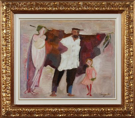 LONGARETTI TRENTO (n. 1916) Famiglia povera e felice. 1982. Olio su tela . Cm 60,00 x 50,00. Firma in basso a destra. Al retro firma, titolo e data. Opera archiviata presso l'Associazione Longretti, Bergamo, come da documentazione fotografica allegata riportante il relativo numero d'inventario. Cornice presente