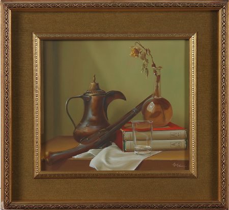 AMBROSINI ROBERTO Natura morta con pistola. Olio su faesite. Cm 40,00 x 36,00. Firma in basso a destra. Cornice presente