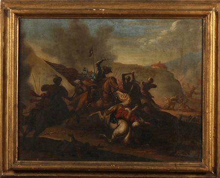 ANONIMO Battaglia. Olio su tela . Cm 74,00 x 58,00. Stile del XVIII secolo. Cornice presente