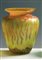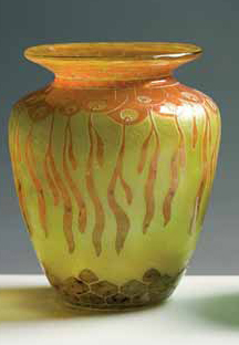 Le Verre Français. Vaso ovoidale in vetro a decori vegetali stilizzati arancioni su fondo giallo, 1925 circa. Firma: murrina altezza cm 29