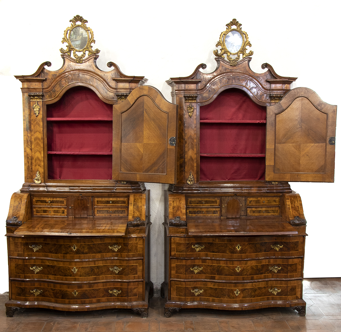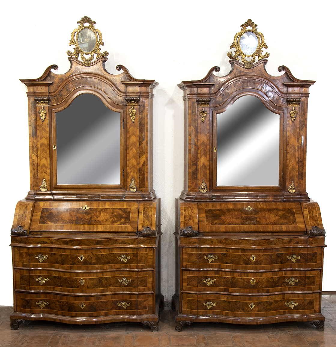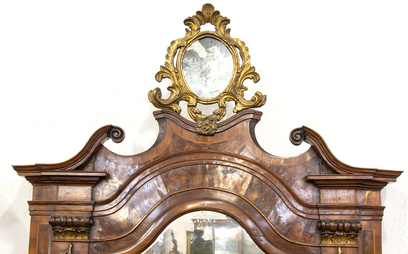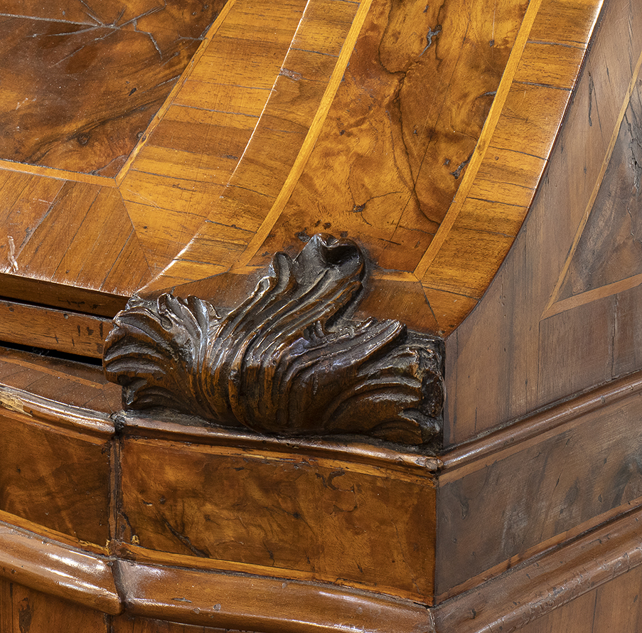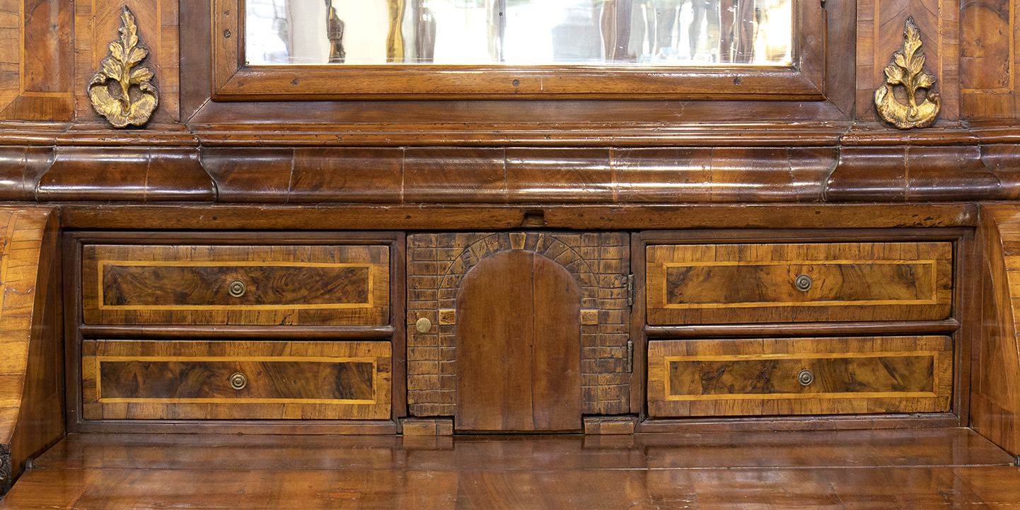 Corpo inferiore con ribalta celante sportello centrale inquadrato da due cassetti per lato, fronte di linea mossa a tre cassetti su piedi a mensola, corpo superiore ad uno sportello con specchio di forma sagomata, cappello modanato con ampia cimasa rocaille in legno dorato e fianchi mossi.