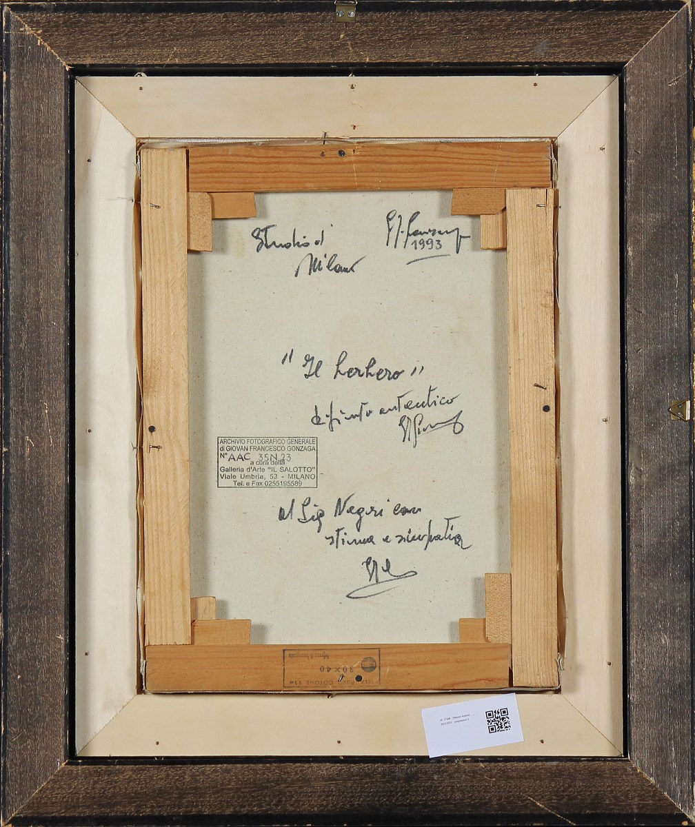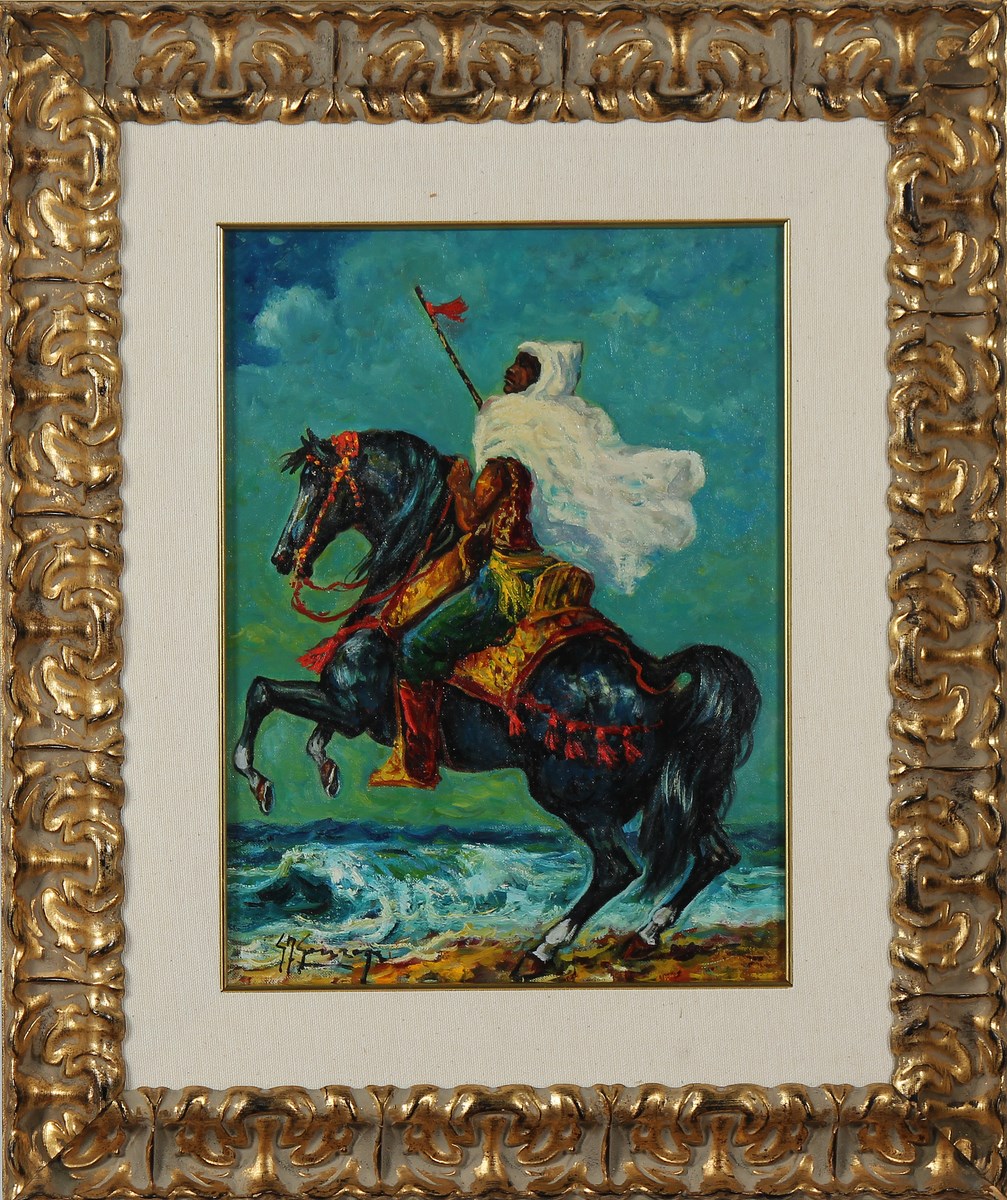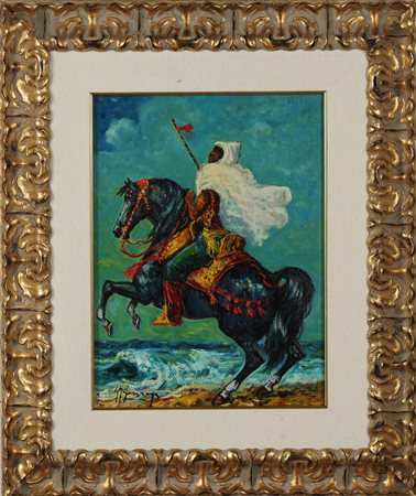 GONZAGA GIOVAN FRANCESCO (1921 - 2007) Il Berbero. 1993. Olio su tela . Cm 30,00 x 40,00. Firma in basso a sinistra. Al retro firma per autentica, titolo, data, timbro dell'Archivio Fotografico Generale di Giovan Francesco Gonzaga con numero d'archivio e dedica. Opera archiviata presso l'Archivio Generale del maestro Giovan Francesco Gonzaga come da documentazione fotografica allegata riportante il relativo numero d'archivio. Cornice presente