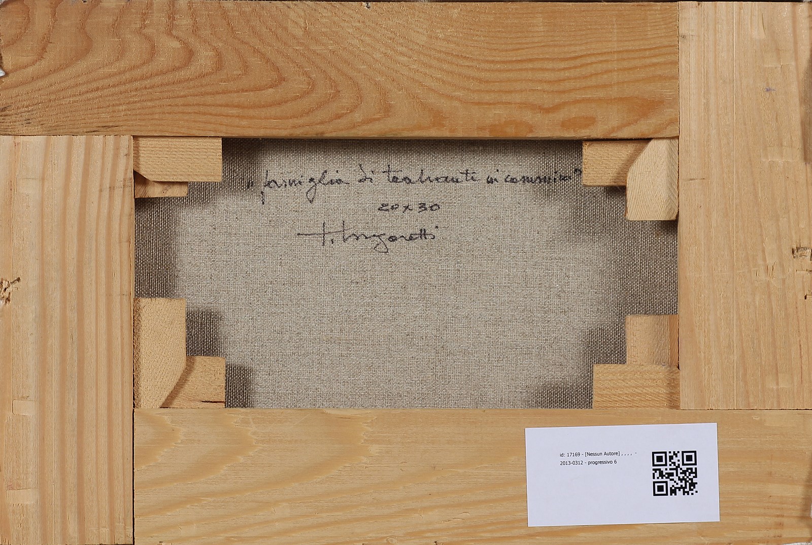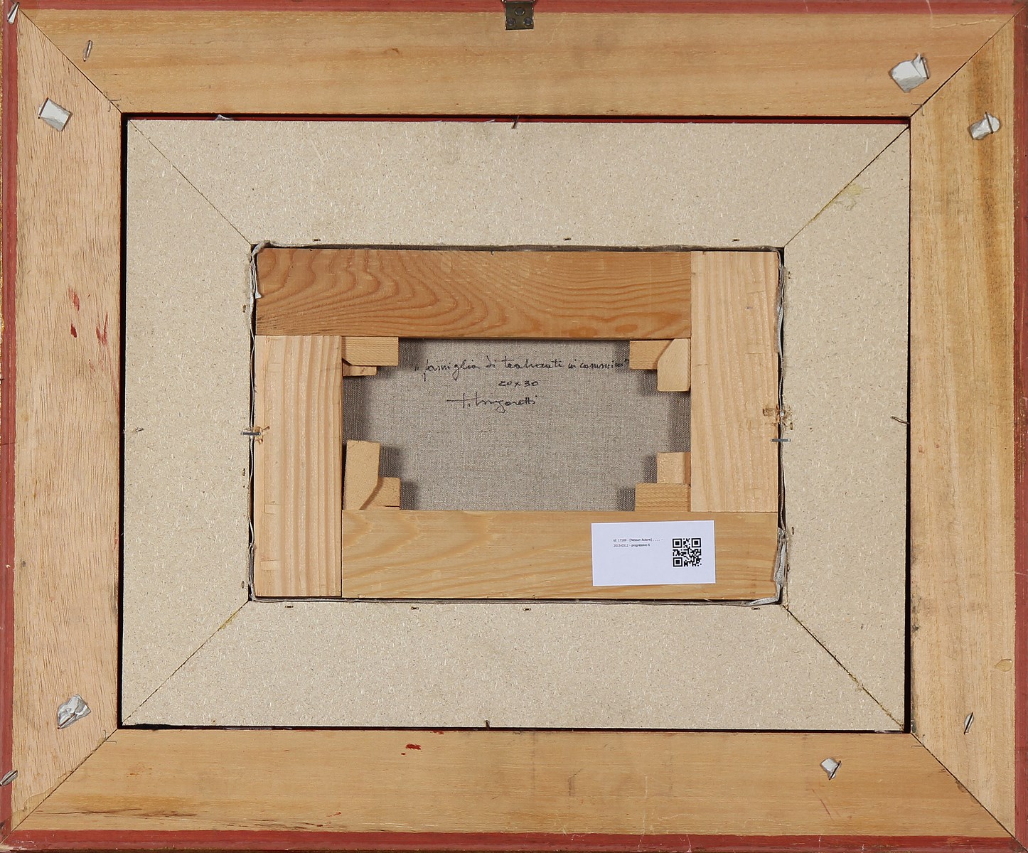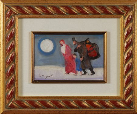 LONGARETTI TRENTO (n. 1916) Famiglia di teatranti in cammino. Olio su tela . Cm 30,00 x 20,00. Firma in basso a sinistra. Al retro firma e titolo. Autentica su fotografia a cura dell'Associazione Longaretti, Bergamo, come da documentazione allegata. Autentica su fotografia a cura della Collezione Camillo Bonacossa, Nerviano, come da documentazione allegata. Cornice presente
