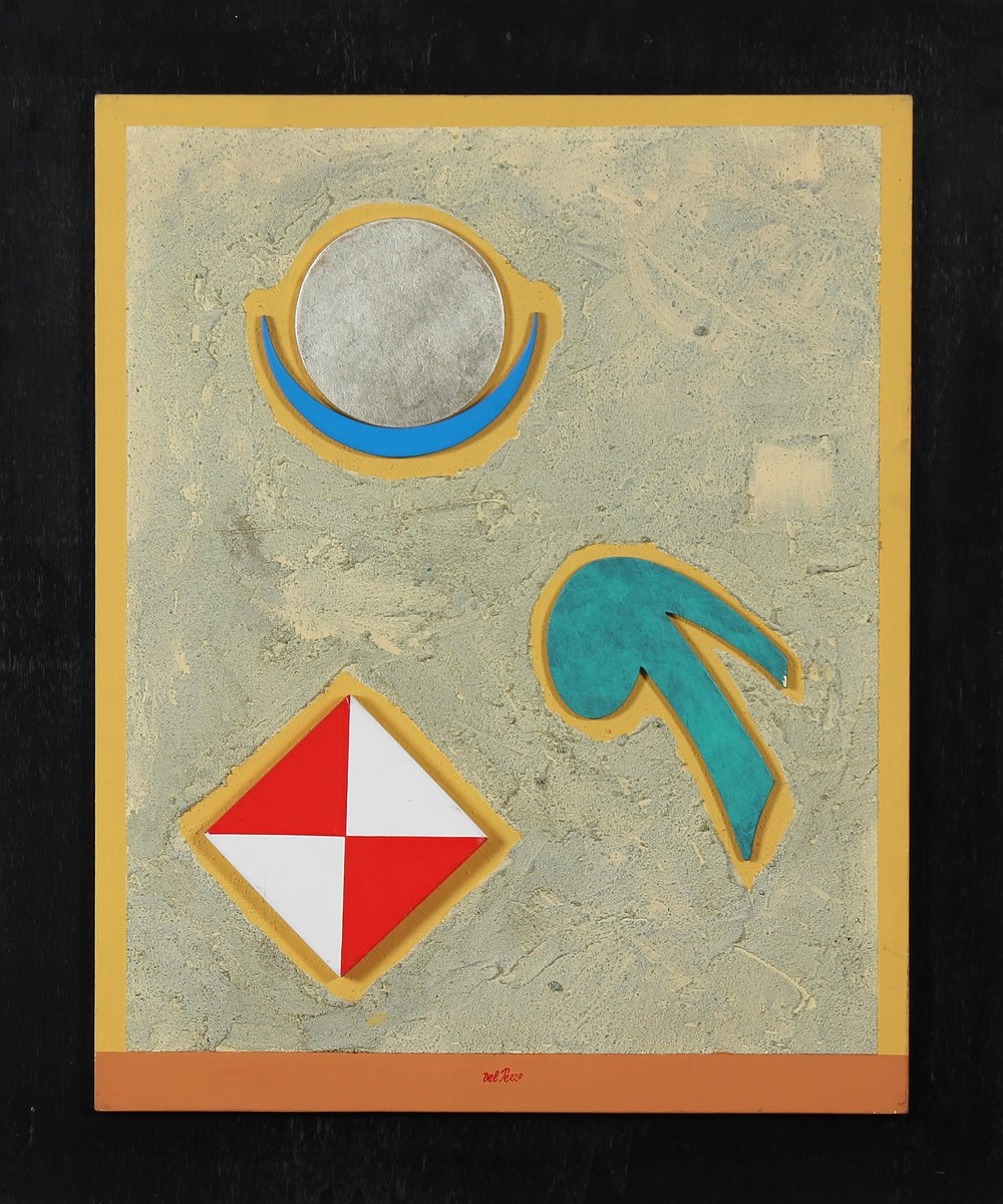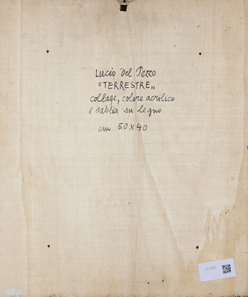 DEL PEZZO LUCIO (n. 1933) Terrestre. 1997. Collage, colore acrilico e sabbia su legno. Cm 40,00 x 50,00. Firma in basso. Al retro firma e titolo. Opera archiviata presso l'Archivio Lucio del Pezzo, Milano, come da documentazione fotografica allegata riportante il relativo numero d'archivio. Cornice presente