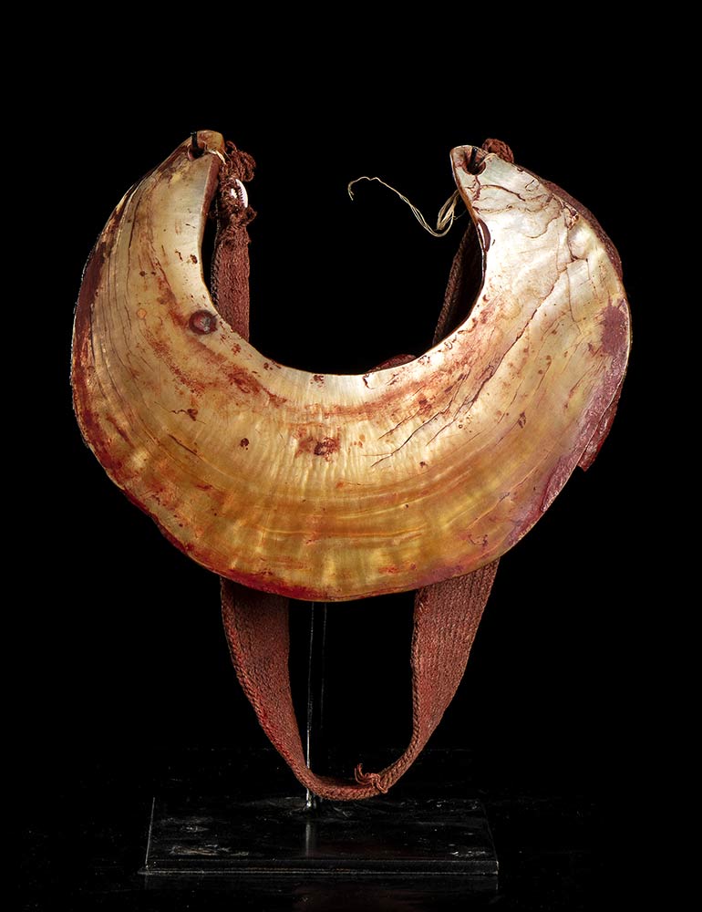 Collana ricavata da un unico pezzo di madreperla chiamata nelle zone del Sud - Est papuano Kina. Papua Nuova Guinea, XX secolo. Base inclusa. Altezza: 30 cm