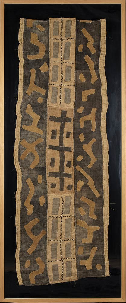 Grande tessuto in rafia Kuba incorniciato. Congo, metà XX secolo. Dimensioni: 185 x 77 cm.