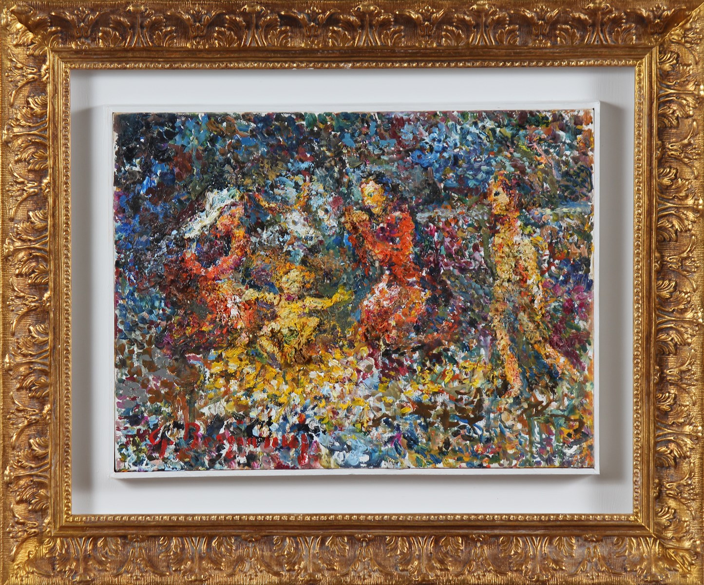 BORGIANNI GUIDO (1915 - 2011) Senza titolo. Olio su tela . Cm 40,00 x 30,00. Firma in basso a sinistra. Al retro articolo di giornale relativo alle mostre realizzate con le opere dell'artista. Opera archiviata presso l'archivio fotografico Guido Borgianni, Galleria d'arte Pntevecchio, Firenze, come da documentazione fotografica allegata riportante il relativo numero d'archivio. Cornice presente