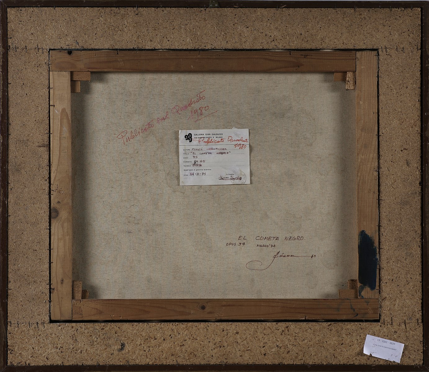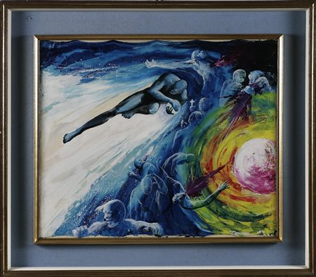 ANONIMO El cometa negro. 1975. Tecnica mista su tela. Cm 60,00 x 50,00. Al retro firmato Perez Hernandez, data, titolo e cartiglio descrittivo dell'opera a cura della Galleria Gian Galeazzo, Milano. Cornice presente